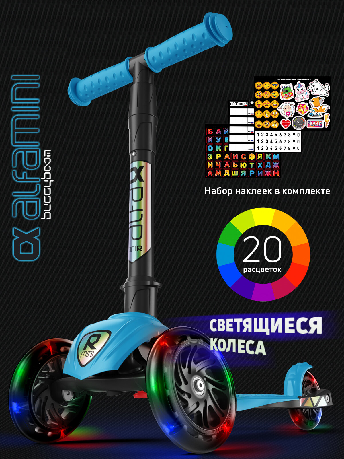 Купить Самокат детский трехколесный со светящимися колесами и наклейками Alfa Mini R Light от Buggy Boom с доставкой по всей России.