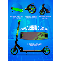 Самокат с Т–образной металлической телескопической ручкой с мягкими накладками, регулируемой по высоте и полиуретановыми маневренными колесами.