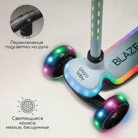 Светящийся трехколесный самокат AmaroBaby Blaze превратит обычную детскую прогулку в настоящий спектр позитивных эмоций! Детский трёхколёсный самокат подходит в качестве первого самоката для ребёнка. Кикборд изготовлен из качественных материалов и не имеет запаха. Выдерживает максимальную нагрузку 50 кг. Дека и рулевая стойка имеют встроенную подсветку из 20 режимов! Питание от трех батареек АА 1,5V (в комплект не входят). Переключаются режимы с помощью кнопки управления, расположенной на руле. Рулевая стойка наклоняется в нужную ребёнку сторону, что даёт возможность уверенно держаться в поворотах, сохранять равновесие. Высота руля регулируется по высоте от 64 до 80 см. Бесшумные полиуретановые колеса светятся во время езды. Диаметр передних колёс составляет 12 см, заднего 8 см. Торможение осуществляется с помощью ножного тормоза, который расположен на заднем колесе. Ребёнку будет удобно стоять на самокате благодаря комфортной длине деки 41 см, и ширине 13,5 см. На деке самоката предусмотрен специальный рельеф, чтобы ножка ребёнка не скользила. Подшипники ABEC-7 обеспечивает плавный ход самокату. Самокат отлично подойдёт в качестве подарка на День Рождения, Новый год, 8 марта. Порадуйте своего ребёнка стильным светящимся самокатом!