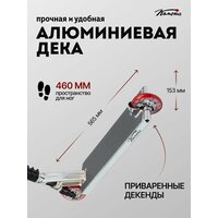 Самокат выполнен в стильном хромированном цвете с красными элементами, что придает ему современный и привлекательный вид.