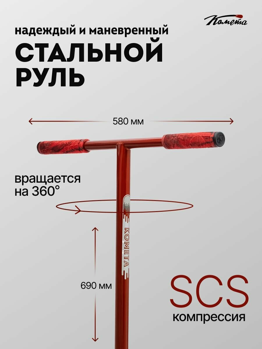 Самокат трюковой Комета Кратос Хром Красный - это надежный и стильный выбор для любителей активного образа жизни. Он предназначен для тех, кто ищет самокат, способный выдерживать большие нагрузки и обеспечивающий комфортное катание.