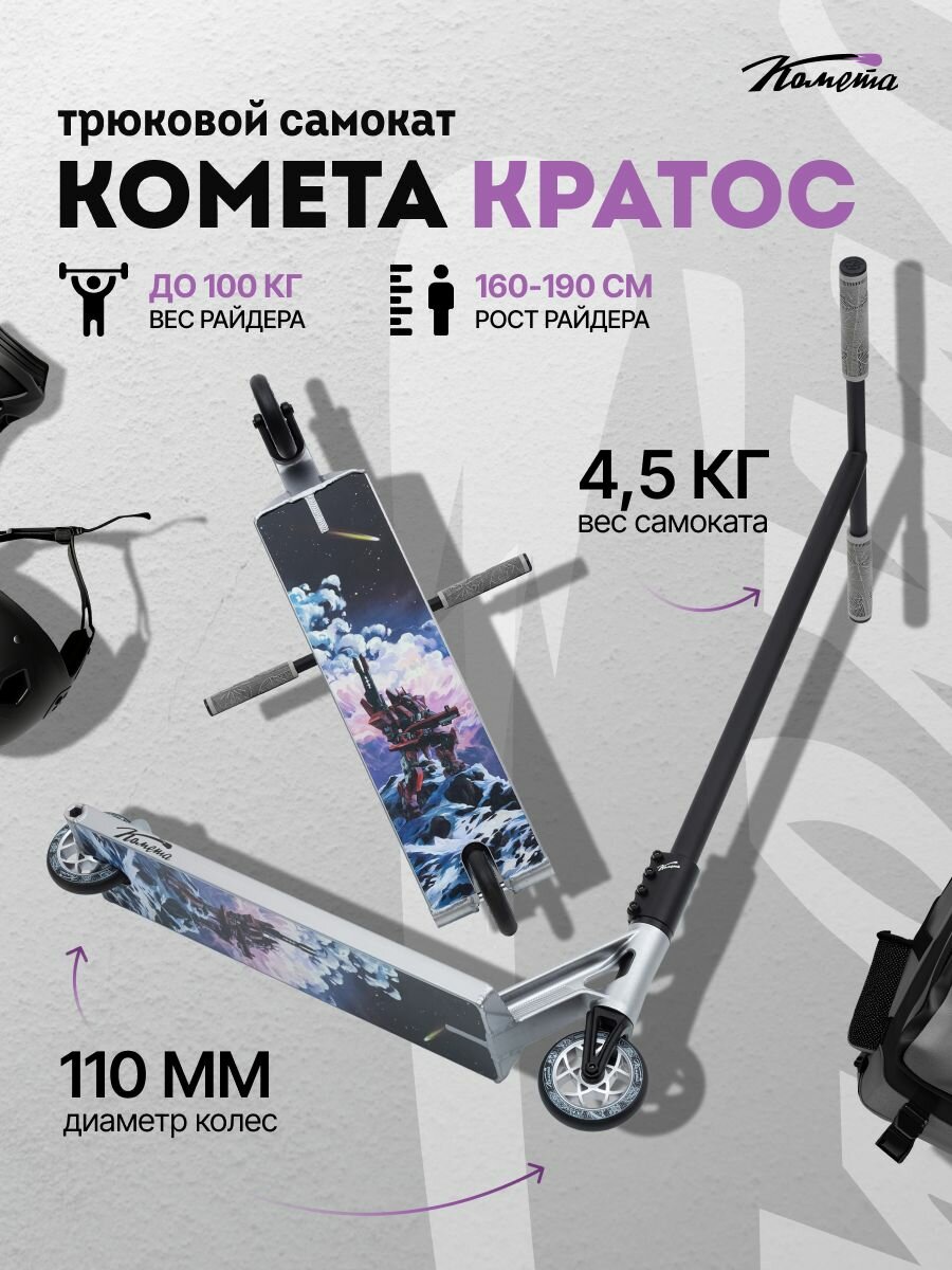 Трюковой самокат двухколесный / стрит Комета Кратос (серый, черный, металлик): сравнение цен, характеристики, фото, актуальное наличие и цены.