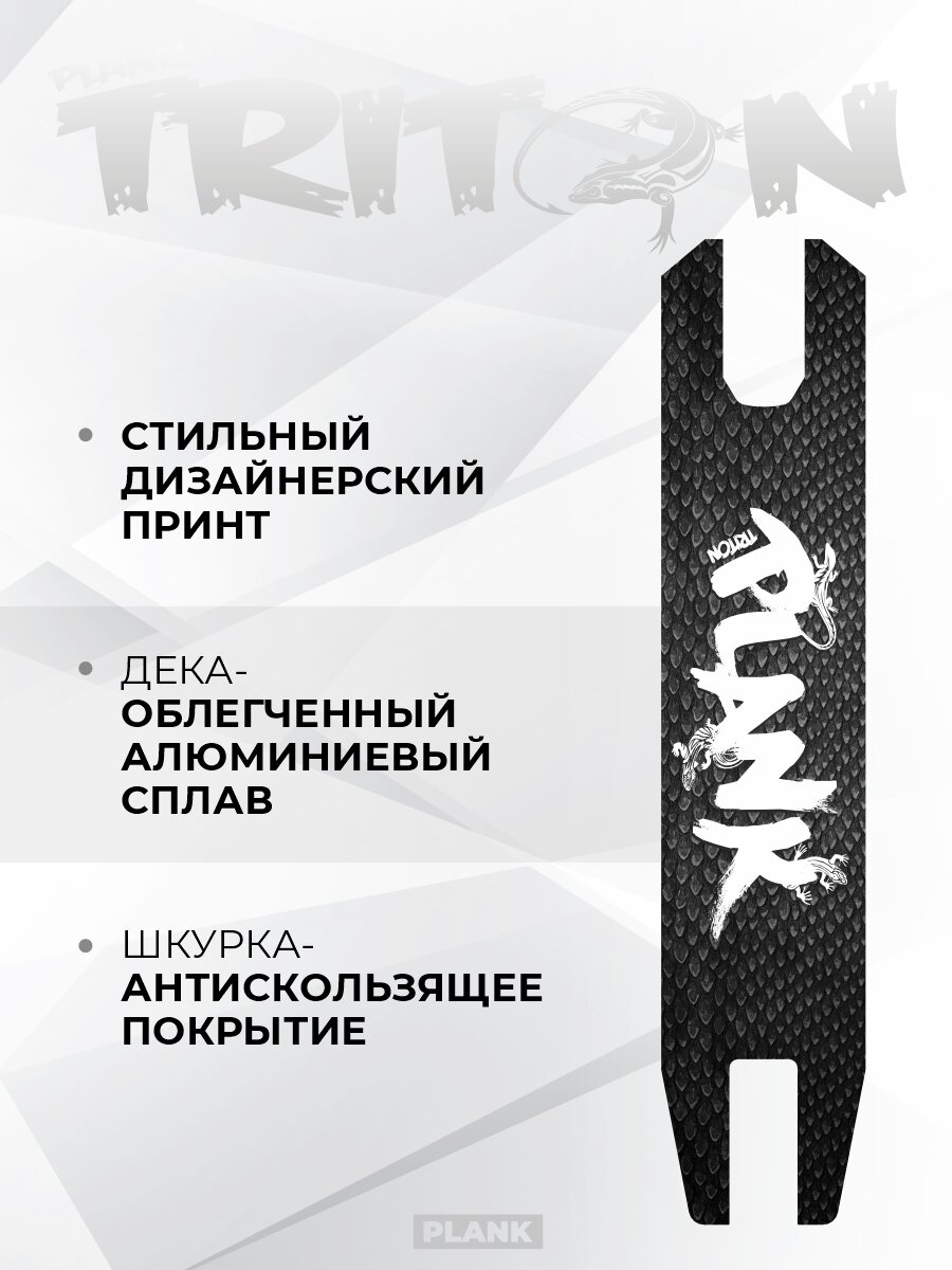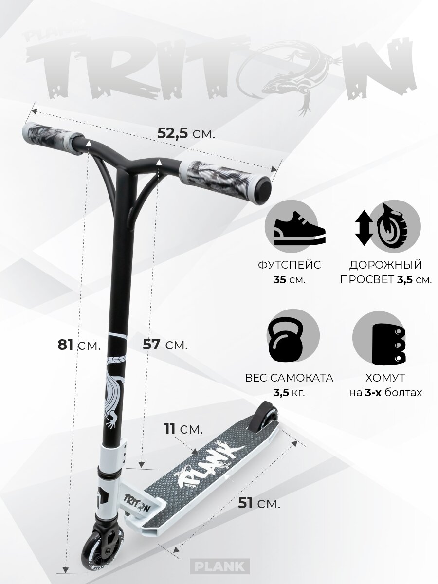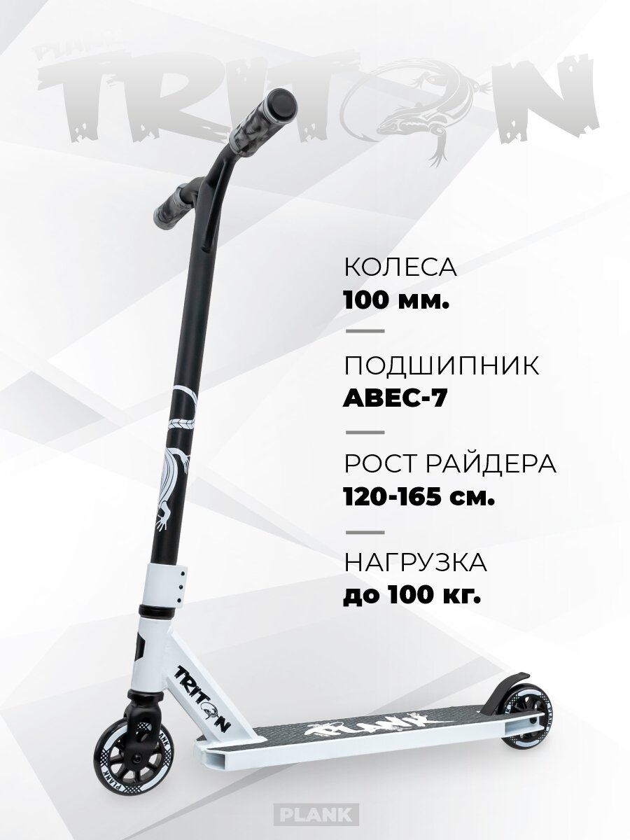 Самокат-снегокат PLANK TRITON 2022 Комплектация зимняя (лыжи) и в комплекте летняя (колеса) Трюковый самокат PLANK TRITON, обладает рядом достоинств профессиональной модели, подходит детям и подросткам для катания в стилях Стрит и Парк. Предназначен для райдеров от 6-ти лет с ростом от 120 до 165см. Оснащен полиуретановыми колесами 100мм с подшипниками ABEC7, легко и быстро крутятся, что обеспечивает хорошую управляемость и скорость, а так же быстрому обучению различных трюков. Усиленный руль с высотой от нижней части зажима 57см, от поверхности земли 81см, ширина руля 52,5см. Трюковой самокат оснащен компрессией HIC. Размеры деки 51см длина, 11см ширина, футспейс 35см. Максимальная нагрузка 100кг. Снегокат - самокат, самокат.