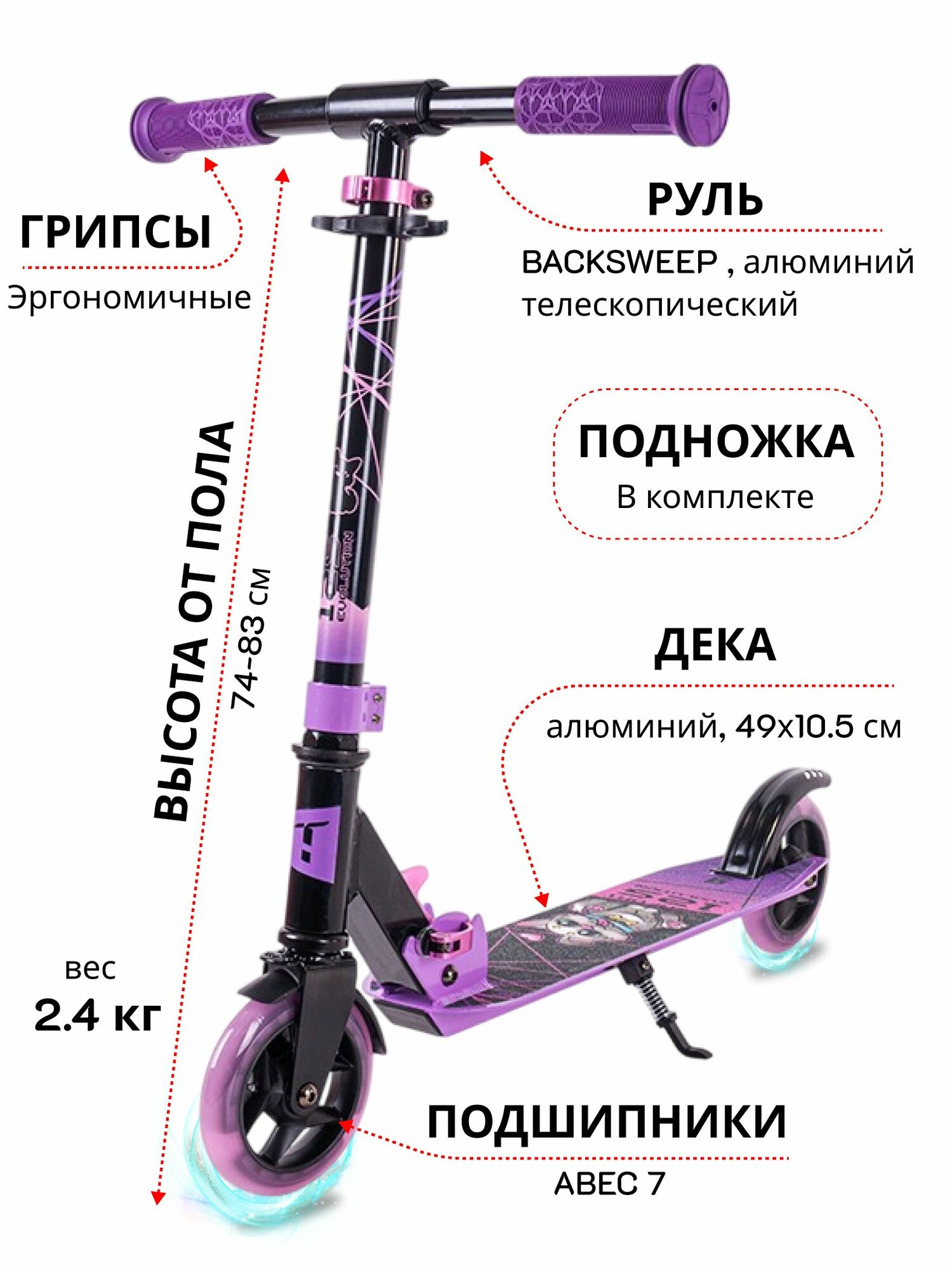 тормоз-крыло; диаметр заднего колеса: 125 мм; ширина деки: 10.5 см; класс подшипника: ABEC 7; вид тормоза: наступной; материал колес: полиуретан; длина деки: 51 см