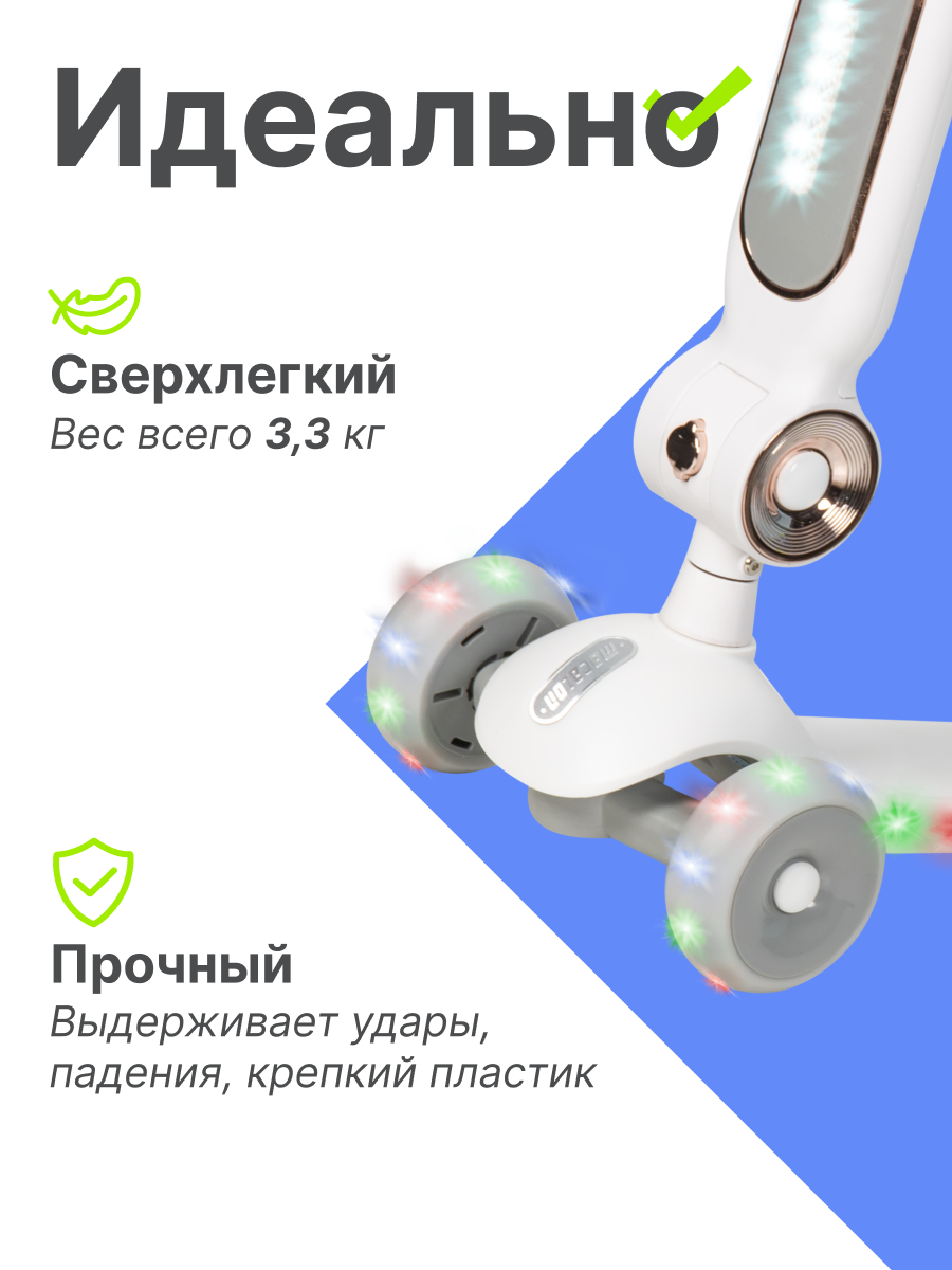 Детский трехколесный самокат трансформер 2 в 1: сиденье встраивается в рулевую стойку, имеет фару для дополнительного освещения в темное время суток.