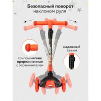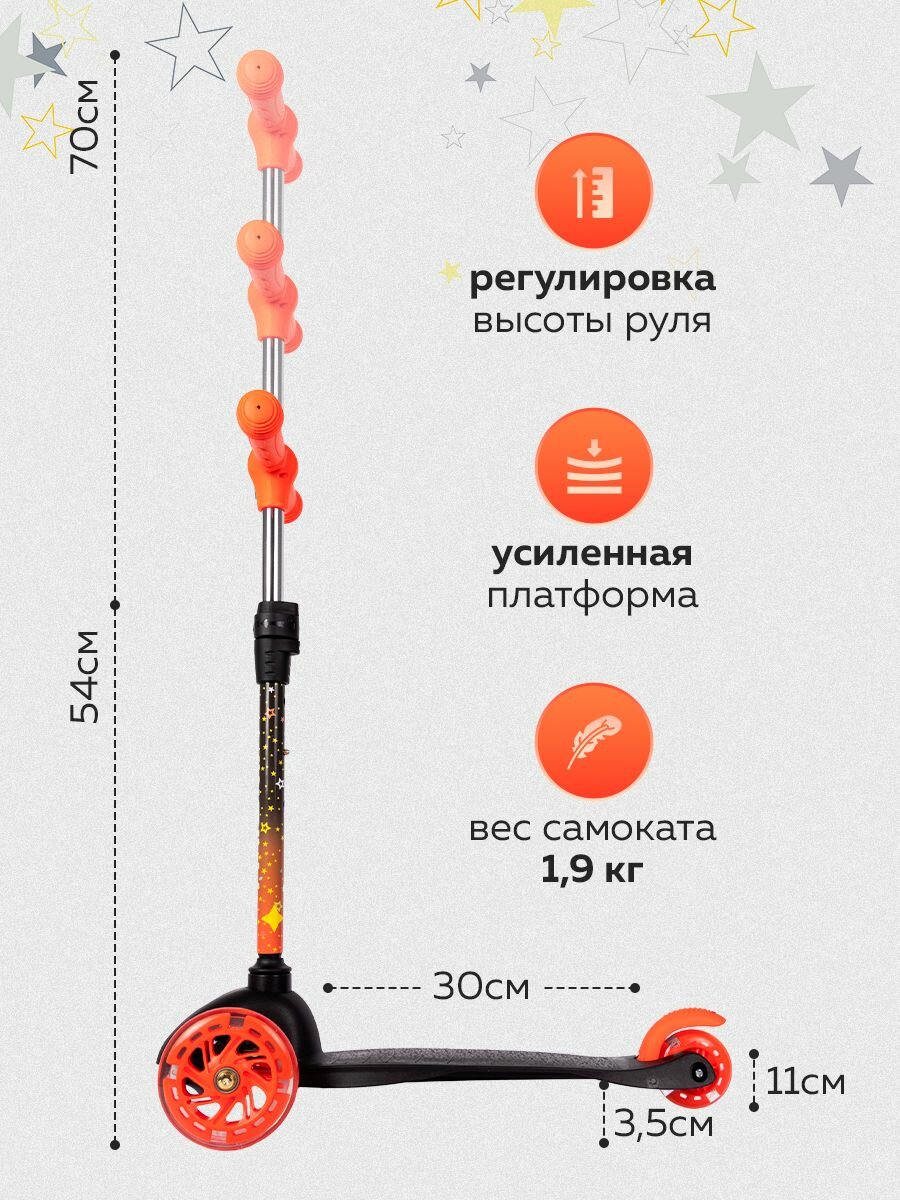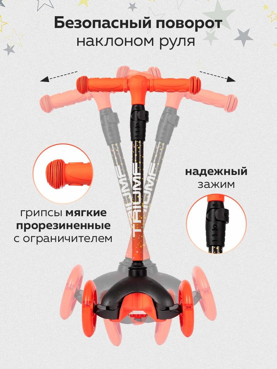 Triumf Active Самокат трехколесный SKL-06AH. Лёгкая долговечная система складывания, прорезиненные ручки. Регулируемая высота руля: от 51 до 72 см. Задний ножной тормоз. Макс.нагрузка: 25 кг. Полиуретановые литые светящиеся колёса жёсткостью 82А. Размер колес: 125 мм, 80 мм. Подшипник: АВЕС-7.