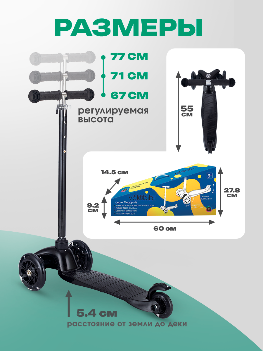 Купить Самокат трехколесный Velobibi серия «MEGAPOLIS» светящиеся колеса, регулируемая высота руля, нагрузка до 50 кг, черный с доставкой по всей России. Самокат трехколесный Velobibi серия «MEGAPOLIS» светящиеся колеса, регулируемая высота руля, нагрузка до 50 кг, черный: сравнение цен, характеристики, фото, актуальное наличие и цены.