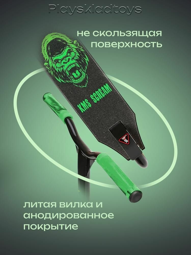Самокат "KMS SCREAM", SK-405, трюковый, от 6 - ти лет; 2х кол; колеса PU+ALU 110мм литое; алюминиевая дека: 500мм х 110мм, цветное анодированное покрытие; Cr-mo черный матовый руль с наклейкой "KMS SCREAM"; алюминиевая вилка; задний тормоз; подшипники Abec 9, рулевой набор Neco.