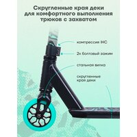 Дека с Конкейвом - специальным изгибом верхней платформы, позволяющим эффективно ловить и контролировать трюки и удерживать ноги на самокате. Округлые края деки, минимизируют травмы ног, и не бьет по рукам при изучении таких трюков как фингервип. Важное отличие деки - кованые оси. Размеры деки 48 см длина, 11 см ширина, футспейс 34 см. Колеса 110х24 мм с алюминиевым сердечником. Рисунок на руле и внизу деки.