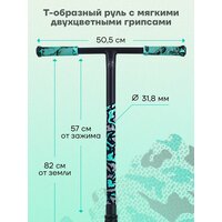 На самокате установлен стальной Т - образный руль, высота от зажима 57 см, высота руля от поверхности земли 82 см, ширина руля 50,5 см, диаметр 31,8 мм. Руль с мягкими двухцветными грипсами 14 см отлично гасят удары и вибрацию, баренды из прорезиненного пластика обеспечивают надежную фиксацию и защищают от травм.
