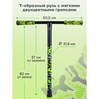 На самокате установлен стальной Т - образный руль, высота от зажима 57 см, высота руля от поверхности земли 82 см, ширина руля 50,5 см, диаметр 31,8 мм. Руль с мягкими двухцветными грипсами 14 см отлично гасят удары и вибрацию, баренды из прорезиненного пластика обеспечивают надежную фиксацию и защищают от травм.