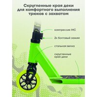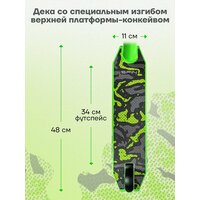 Дека с Конкейвом - специальным изгибом верхней платформы, позволяющим эффективно ловить и контролировать трюки и удерживать ноги на самокате. Округлые края деки, минимизируют травмы ног, и не бьет по рукам при изучении таких трюков как фингервип. Важное отличие деки - кованые оси. Размеры деки 48 см длина, 11 см ширина, футспейс 34 см. Колеса 110х24 мм с алюминиевым сердечником. Рисунок на руле и внизу деки.