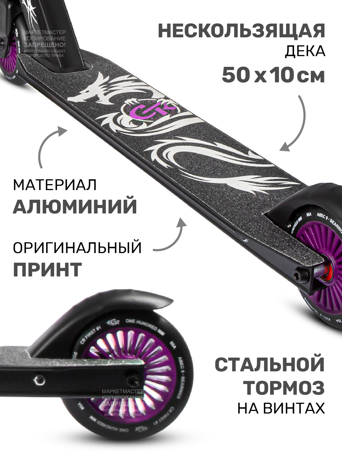 тормоз-крыло; диаметр заднего колеса: 100 мм; ширина деки: 10 см; класс подшипника: ABEC 9; вид тормоза: наступной; материал колес: полиуретан; длина деки: 48 см