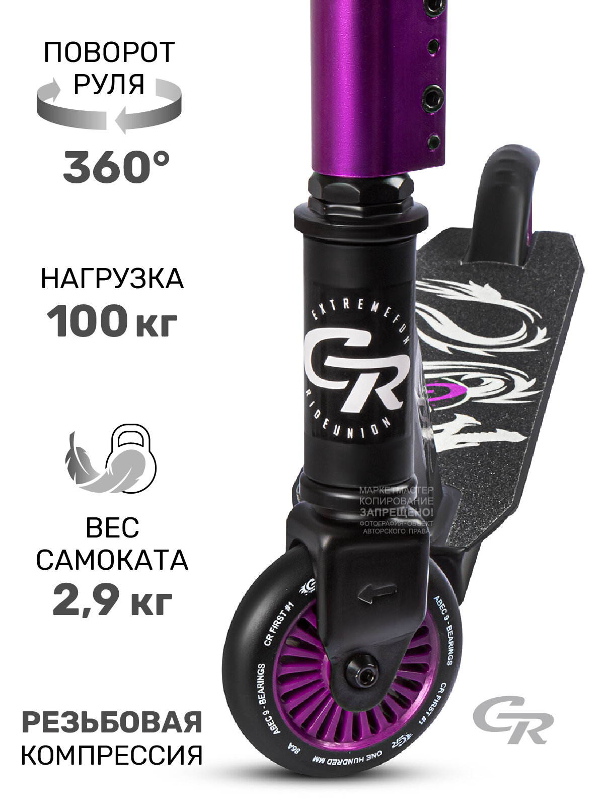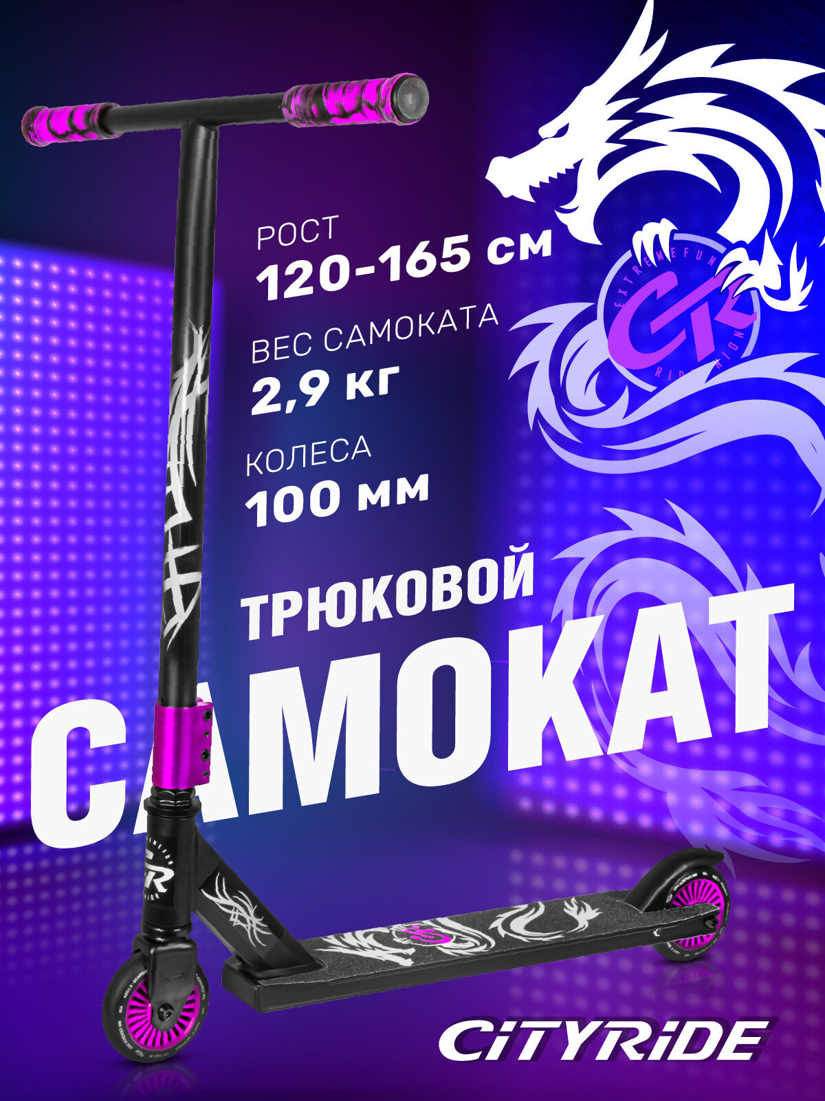 Трюковый самокат CityRide отлично подойдет для начинающего райдера. С ним легко освоить первые трюки и получить массу положительных эмоций от экстремального катания. • Алюминиевый хомут и диски надежно защищены от коррозии и внешних повреждений • Легкая и прочная алюминиевая дека 50*10 см • Оптимальная высота руля 55 см подойдет многим начинающим райдерам. Высота от пола 78 см • Прочность самоката обеспечивается за счет усиленной передней вилки и усиленной 4-х болтовым алюминиевым хомутом стойки стального руля • Компрессия на основе резьбовой вилки • Руль вращается на 360°, что позволяет делать разнообразные трюки • Износостойкие грипсы из прозрачного TPR препятствуют скольжению рук и делают катание максимально безопасным • Колеса размером 100 мм из полиуретана обладают исключительной подвижностью и маневренностью благодаря подшипникам Abec 9 • Стальной тормоз устроен максимально просто, но при этом отличается надежностью и удобством эксплуатации.