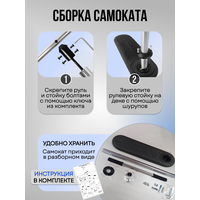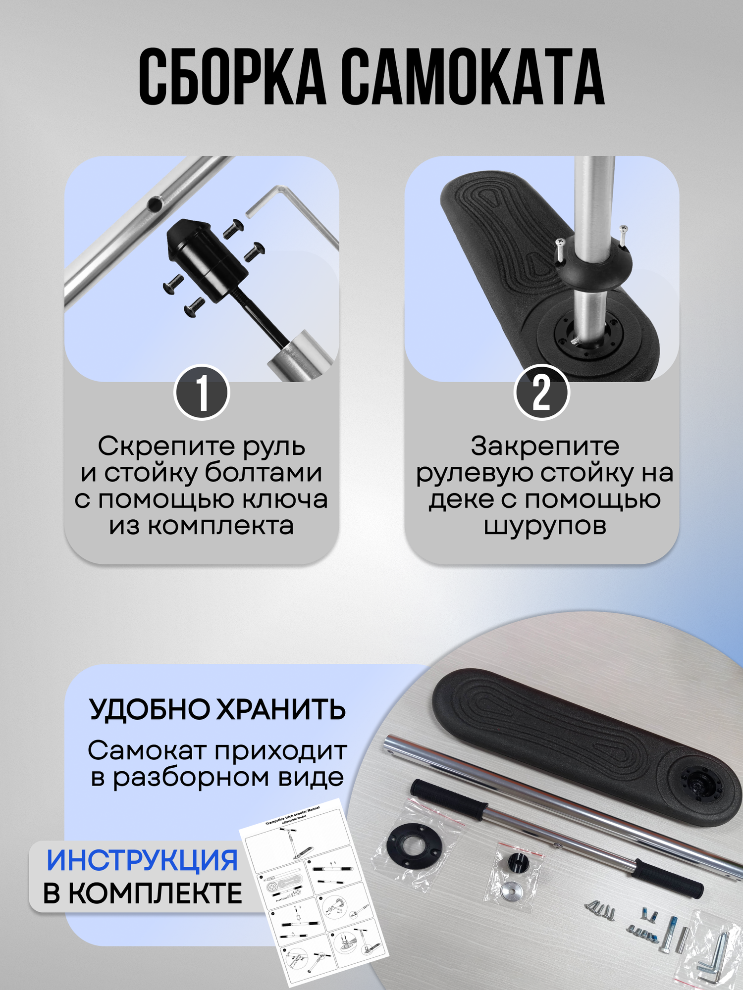 Комплектация: *алюминиевая рулевая стойка, высота 67 см, ширина 35 см, *накладки на руль для удобства ладоней (грипсы, черные), *дека из мягкого эластичного полипропилена, *крепёжные детали для сборки (в пластиковом пакете), *предварительно смазанный подшипник.