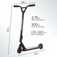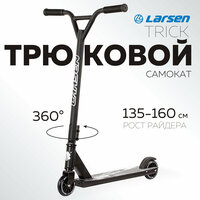 Двухколесный самокат Larsen Street Trick рекомендован для людей ростом от 160 до 175 см. Материал рамы: 50% сталь, 50% алюминий. Ширина руля - 480 мм, высота руля - 820 мм. Материал ручек: TPR (термопластичная резина). Материал колес: полиуретан с ободами из полипропилена. Высота рулевой стойки: 82 сантиментра, не регулируемая (для большей жёсткости самоката). Максимальный вес пользователя : до 100 кг.