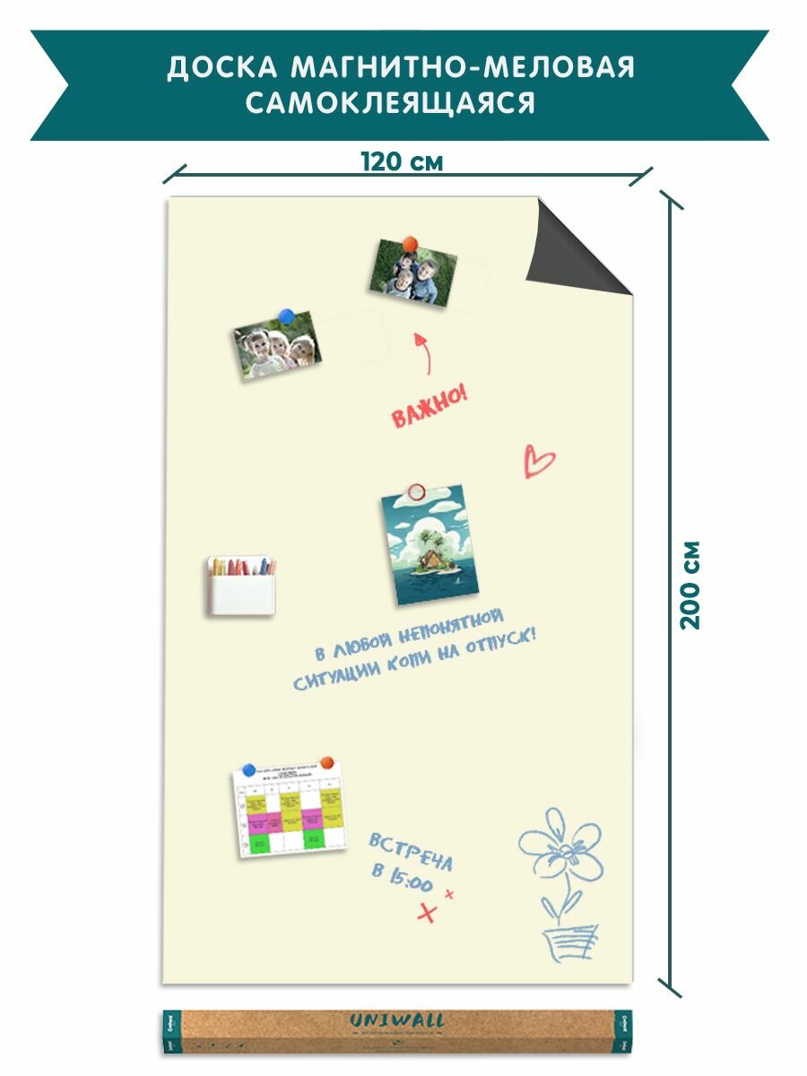 Гибкая Самоклеящееся магнитная доска UNIWALL в рулоне - это лучший выбор для тех, кто ищет практичное и стильное решение для рисования и обучения. Размер доски 120х200 см Для магнитно-меловых досок юнивол необходимо использовать мягкий мел и меловые маркеры, неодимовые или легкие магниты с полностью магнитным оборотом. Некачественные и слабые магниты могут соскальзывать с магнитной доски. Доска юнивал для рисования изготовлена из высококачественного матового полипропилена, металлизированных слоев и самоклеящейся основы. Она не царапается, имеет антибликовое покрытие и водоотталкивающие свойства, функциональней и эффективней чем доска в раме, не дребезжит при использовании. Стильно смотреться в современных офисах и школах. Инструкция по монтажу 1. Выберите ровную, гладкую поверхность. 2. Очистите поверхность от пыли. 3. Заранее защитную пленку не снимайте, снимайте ее только перед монтажом не более чем на 10 см. Затем постепенно снимая защитную пленку, постепенно раскатывайте магнитную доску по стене. Рекомендуется тщательно прикатать всю доску пластиковым шпателем, особое внимание уделите краям доски. Создавайте свой идеальный офис или класс без усилий – наш бренд предлагает самые качественные наборы для офиса и школы, которые включают в себя доски для рисования маркером, школьные доски, магнитные доски и доски для рисования с магнитными игрушками. Для тех, кто ищет стильные и практичные элементы декора – мы предлагаем широкий ассортимент досок настенных, досок для рисования, а также магнитно-маркерных, магнитных пленок и досок, которые точно подойдут для любого интерьера. Магнитная доска - идеальный подарок для детей, коллеги или родственников на 8 марта и 23 февраля. Подарок на день рождения мальчику и девочке, подарок на новый год, новогодние игрушки Самоклеящаяся основа клеится одной полосой, встык клеить нельзя (если вы хотите поклеить всю стену целиком или несколько полос встык используйте обои UNIWALL на бумажной основе