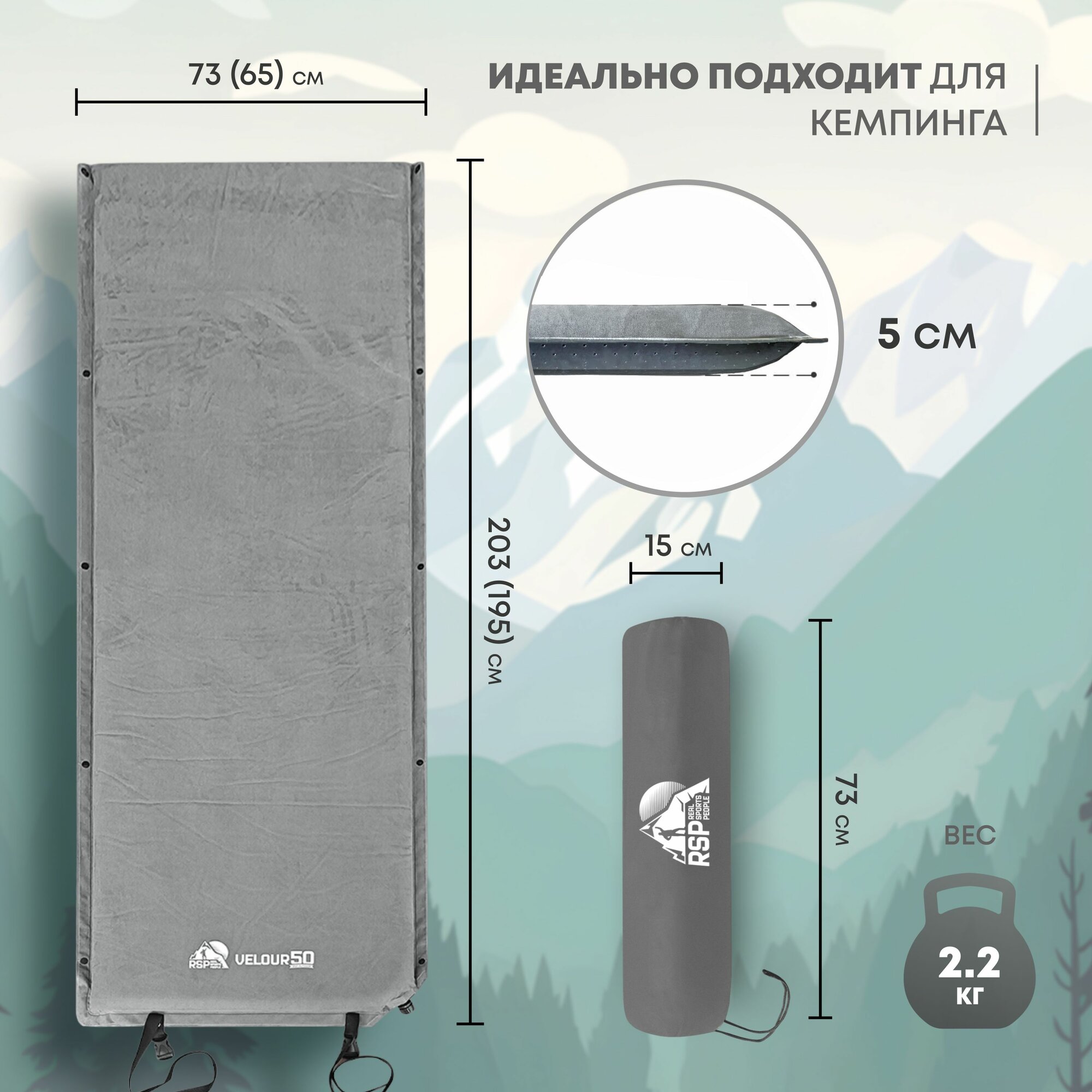 Самонадувающийся коврик VELOUR 50 от компании RSP – отличный выбор для туризма и кемпинга. За счет своей толщины в целых 50 мм а так же высоких показателей теплоизоляции он способен обеспечить вам комфортный сон в любое время года. Коврик имеет прямоугольную форму и увеличенные размеры: длина – 188 см, а ширина – 66 см. Но при этом его размер в сложенном виде всего 70*15 см, что сопоставимо с размерами обычного туристического коврика-пенки толщиной 1,2 см. VELOUR 50 имеет вес всего 2 кг, а допустимая нагрузка составляет 130 кг.