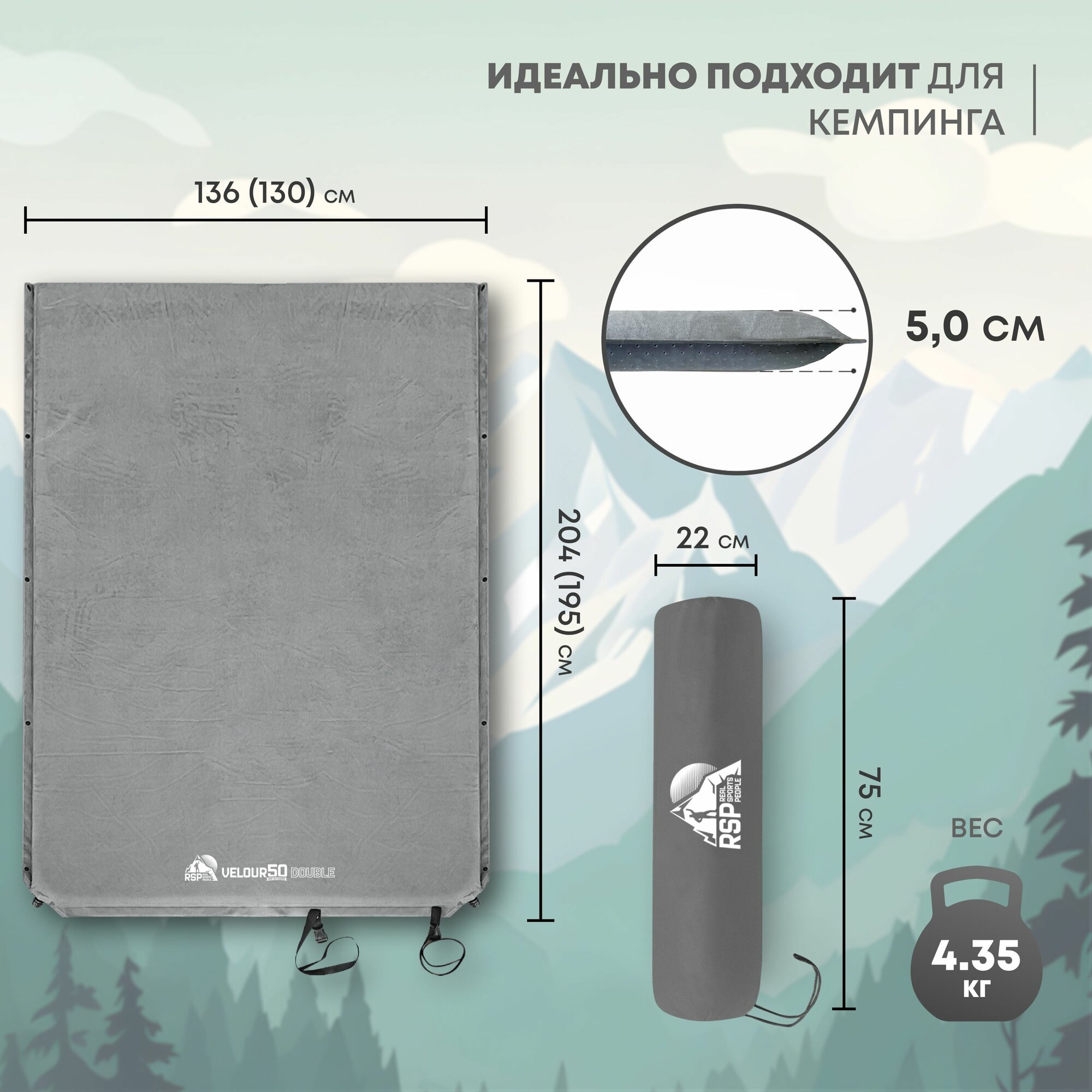 Самонадувающийся коврик VELOUR 50 Double от компании RSP – отличный выбор для кемпинга. За счет своей толщины в целых 50 мм а так же высоких показателей теплоизоляции он способен обеспечить вам комфортный сон в любое время года. Коврик имеет прямоугольную форму и увеличенные размеры: длина – 204 см, а ширина – 136 см.(размеры надуваемой части: длина - 195 см, ширина - 130 см.) Но при этом его размер в сложенном виде всего 75*22 см. VELOUR 50 Double имеет вес всего 4.35 кг, а допустимая нагрузка составляет 250 кг.