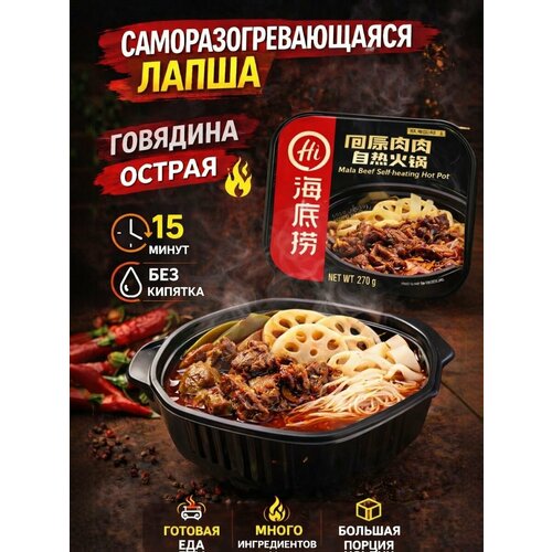 Саморазогревающаяся лапша HotPot с пряно-острой говядиной — это популярное блюдо азиатской кухни, которое можно приготовить без плиты и без кипятка. Внутри упаковки находится специальный нагревательный элемент: достаточно добавить воды, и контейнер самостоятельно нагреет содержимое до температуры кипения.