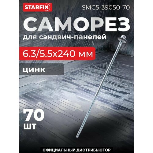 Саморез STARFIX SMC5-39050-70 имеет размеры А/ВхС, мм: 6.3/5.5х240, длину резьбы под головкой - 14-16 мм и длину резьбы - 58-62 мм. В упаковке содержится 70 штук саморезов.