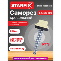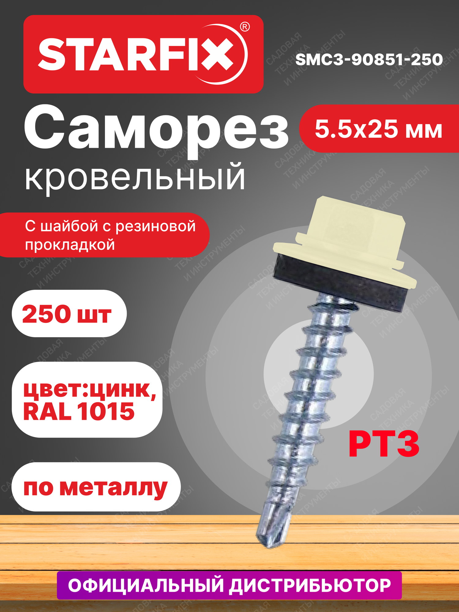 Саморез кровельный 5.5х25 мм цинк шайба с прокладкой PT3 RAL 1015 STARFIX 250 штук (SMC3-90851-250): сравнение цен, характеристики, фото, актуальное наличие и цены.