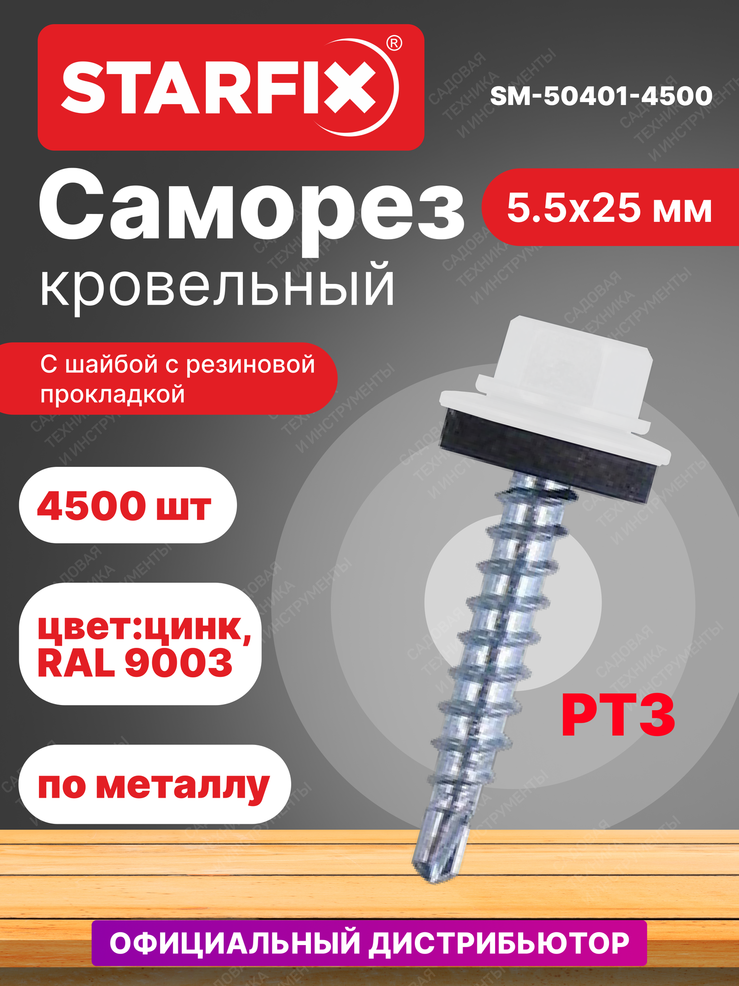 Саморез кровельный 5,5х25 мм цинк шайба с прокладкой PT3 RAL 9003 STARFIX 4500 штук (SM-50401-4500): сравнение цен, характеристики, фото, актуальное наличие и цены.