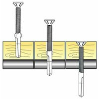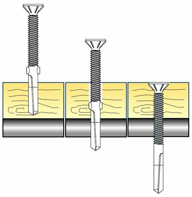 2. Форма и конструкция: саморез флюгель имеет особую форму, а именно – наличие сверловидных крыльев для расширения отверстия в древесине под тело шурупа, наконечник сверло 7 мм и резьбу с частым шагом. В процессе монтажа бур проходит сквозь дерево к металлу, а крылья расширяют отверстие для того чтобы волокна древесины не забивали каналы резьбы. После прохождения буром металла, крылья обламываются способствуя дальнейшему прохождению шурупа в стальное основание.