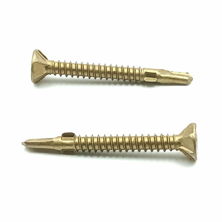 Саморез флюгель 4,8х45 специальный вид шурупов, предназначенный для надежного и прочного крепления деревянных элементов к металлическим поверхностям. Он имеет специфическую форму и конструкцию, которая обеспечивает качественное и долговечное соединение дерева с металлом. Описание шурупа флюгель с крыльями: 1. Материал изготовления: изготавливаются из высокопрочной стали с антикоррозийным цинкламелевым покрытием, что обеспечивает их долговечность и устойчивость к внешним воздействиям. 2. Форма и конструкция: саморез флюгель имеет особую форму, а именно – наличие сверловидных крыльев для расширения отверстия в древесине под тело шурупа, наконечник сверло 7 мм и резьбу с частым шагом. В процессе монтажа бур проходит сквозь дерево к металлу, а крылья расширяют отверстие для того чтобы волокна древесины не забивали каналы резьбы. После прохождения буром металла, крылья обламываются способствуя дальнейшему прохождению шурупа в стальное основание.