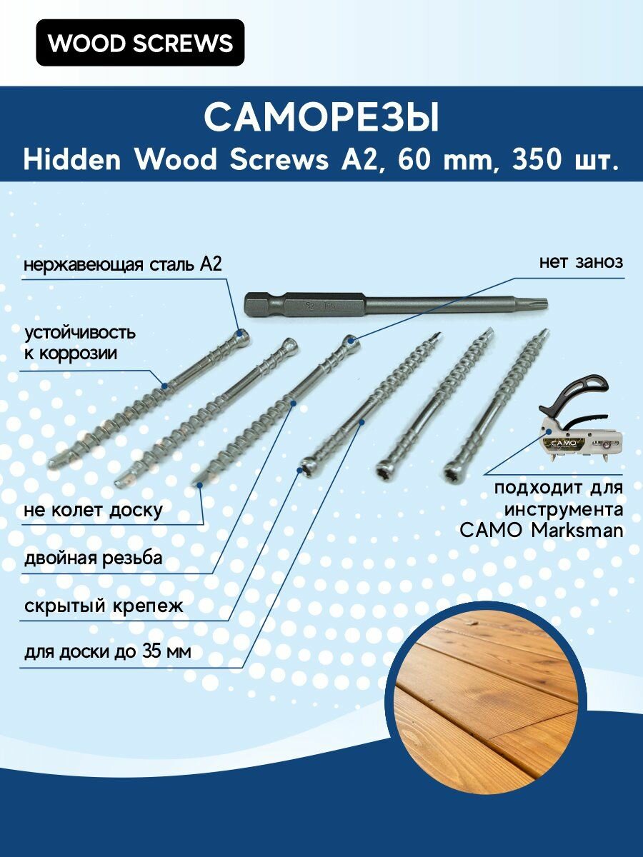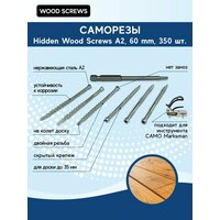 Расход 35 саморезов на 1 метр квадратный. Нержавеющая сталь класса AISI304. Устойчивость к коррозии. Повышенная прочность. Без засверливания (*применяйте сверло Hidden Wood Screws для крепежа термодерева и твердых экзотических пород). Двойная резьба: агрессивная нижняя резьба обеспечивает прочность, а верхняя левая — сцепление с конструкцией. Бита в каждой коробке. По техническим допускам и характеристикам Вы можете использовать данные саморезы вместо CAMO и др.