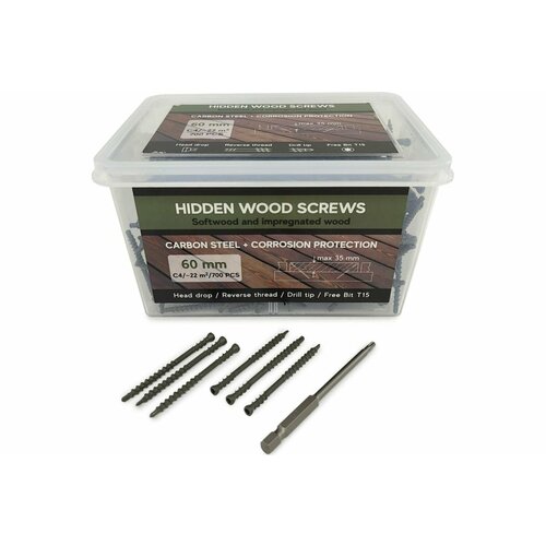 Саморезы с антикорр. покрытием для скрытого монтажа террас и фасадов Camo Hidden Wood Screws C4 60 mm, 700 шт. 60700C4 произведены из углеродистой стали класса AISI1018 с двойным покрытием ProTech и предназначены для крепления террас и фасадов из дерева. Идеально подходят для ели, сосны, импрегнированной сосны, термодревесины. Саморезы 60 мм используются для работ с досками толщиной 28-37 мм. Расход: 35 саморезов на 1 кв. м.