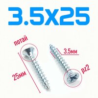 Саморез 3,5 х 25 оцинкованный по дереву и металлу с универсальной резьбой. Диаметр самореза - 3,5 мм, длина - 25 мм. Головка – потайная. Шлиц - PZ2 Материал - углеродистая сталь, оцинкованная.