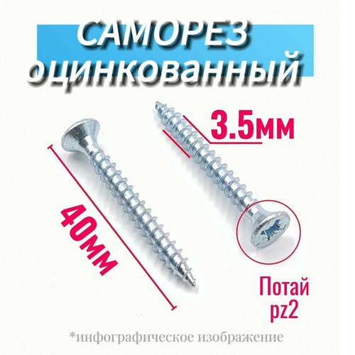 Саморез 3,5 х 40 оцинкованный по дереву и металлу с универсальной резьбой. Диаметр самореза - 3,5 мм, длина - 40 мм. Головка – потайная. Шлиц - PZ2 Материал - углеродистая сталь, оцинкованная.