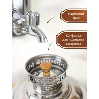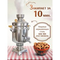 Самовар изготовлен из пищевой нержавеющей стали, что обеспечивает его долговечность и надежность. Материал корпуса устойчив к коррозии и высоким температурам, что позволяет использовать самовар на открытом огне.