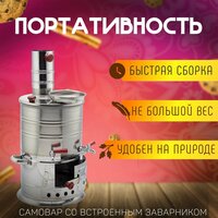 Изготовлены из нержавеющей стали AISI 430 (температура плавления 1425 С, прочность на разрыв 450 МПа) толщиной от 0,4 мм до 1 мм. Конструкция самовара продумана для более быстрого закипания, не в ущерб сроку службы. Самовар турецкий дровяной 2 краника , отсек заварочный. Самовары изготовлены из пищевой нержавеющей стали толщиной от 0,5 мм до 0.9 мм. Благодаря небольшой толщине стенок, время от разжигания самовара до его закипания занимает 14 минут. В комплект входит труба для отвода дыма. Топливо для самовара (лучина, шишки, древесный уголь) при сгорании придаёт жидкости особенный привкус. Чайный лист в такой воде полностью раскрывает свой вкус и аромат. Отличный атрибут и подарок для дачников, рыбаков, охотников, туристов, авто и путешественников и просто любителей чайных мероприятий на открытом воздухе или берегу реки. Самовар очень удобный, прост в использовании, его удобно мыть и топить в сравнении с угольным советским, закипает очень быстро примерно 7-8 минут.