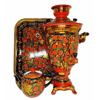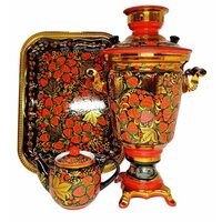 Самовар набор роспись. "Хохлома". Материал: латунь, расписанная специальными термо красками и покрыт термостойким лаком. Объем: 3 л. Мощность нагревательного элемента: 1 кВт. Время закипания: 10-15 мин. Размеры упаковки: 30×30×40 см. Внутреннее покрытие: пищевое олово. Гарантия 1 год. Вес: 2800 грамм. Производитель: г. Тула. Форма овал.
