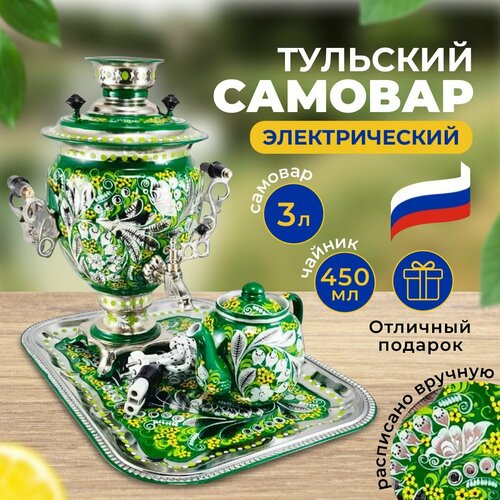 Самовар электрический, зеленый «Ландыши на серебре» с хохломской росписью, 3 литра: сравнение цен, характеристики, фото, актуальное наличие и цены.