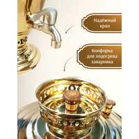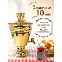 Самовар "Курай" - это жаровой самовар из нержавеющей стали объемом 5 литров. Он выполнен в золотистом цвете, что придает ему особый шарм и эстетику.