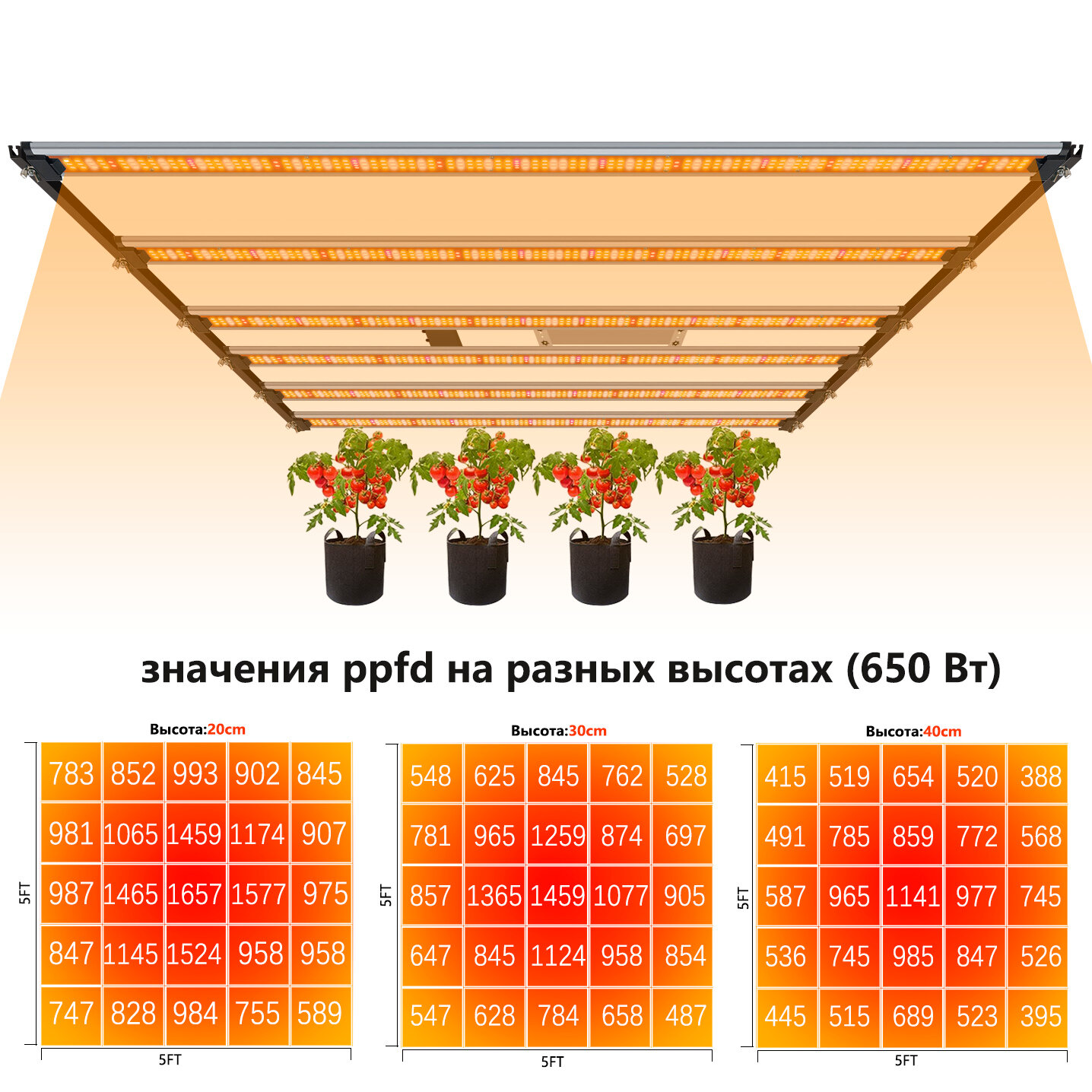 - Мощность: 650 Вт, что обеспечивает достаточное освещение для растений на всех стадиях роста. - Количество светодиодов: 1944 шт, что гарантирует равномерное и яркое освещение. - Цвет света: теплый белый, который способствует росту и развитию растений. - Материал корпуса: металл и пластик, что обеспечивает прочность и долговечность конструкции. - Вид рассеивателя: прозрачный, позволяющий свету равномерно распределяться по всей площади. - Комплектация: водитель, модулятор света, коробка управления, таймер, крюк, что упрощает процесс использования и настройки. - Дополнительная информация: время, что позволяет настроить работу фитолампы в соответствии с потребностями растений.
