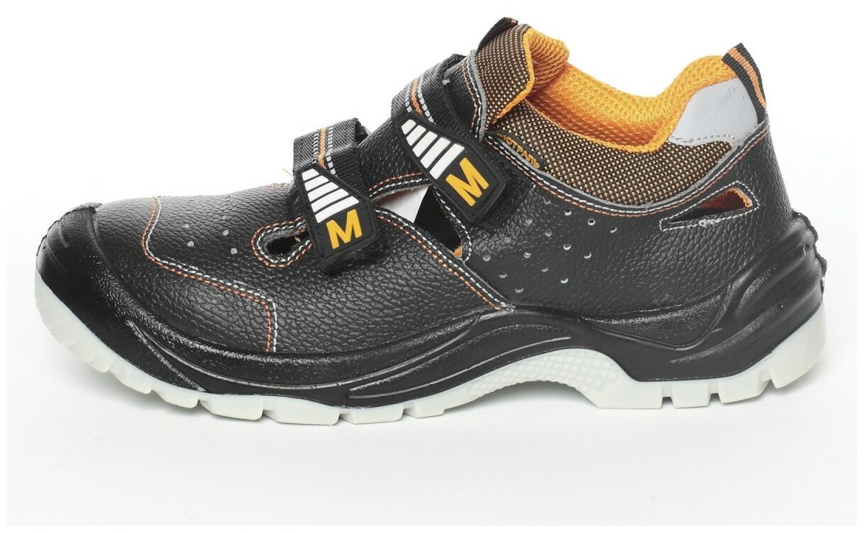 Особенности конструкции и эксплуатации рабочих сандалей. Верх рабочей обуви изготовлен из кожи. Вставки из текстиля вокруг голеностопного сустава снижают давление на ногу и уменьшают вес обуви. Отверстия на сандалиях обеспечивают теплообмен и испарения пота - это обеспечивает комфортный микроклимат для ног. Укреплённый поликарбонатный подносок выдерживающий удар 200 Дж. Подносок защищает от надавливание сверху, спереди и по бокам в носочную часть. Такая защита особенно актуальна при работе на стройке или монтаже металлических конструкций. Колодка анатомической формы исключает потёртости и снижает нагрузку на стопы. В носочной части отверстия для воздухообмена. Антипрокольная стелька 1 200 Н. Стелька защищает не только от проколов и порезов, но и уменьшает давление на стопы при хождении по неровным поверхностях, часто встречающимся на стройке или производстве. Подошва двухслойная полиуретан-термополиуретан (ПУ-ТПУ). Верхний полиуретановый слой хорошо амортизирует во время ходьбы, снижает нагрузку на суставы ног. Благодаря полиуретановому слою ботинки отличаются легкостью и удобством, термопластичный полиуретан защищает подошву от стирания и деформации. Рисунок протектора обеспечивает надёжное сцепление с любой поверхностью, есть эффект самоочищения - грязь легко отстаёт от подошвы. Метод крепления подошвы к верху литьевой. Подошва с верхом соединяется герметично, не пропускает влагу и пыль. Сферы использования: добыча полезных ископаемых, стройка, работа с металлическими конструкциями, транспорт, сельское хозяйство. Во время изготовления соблюдается ТР ТС 019/2011.