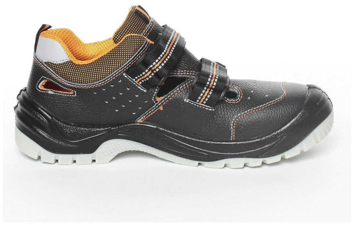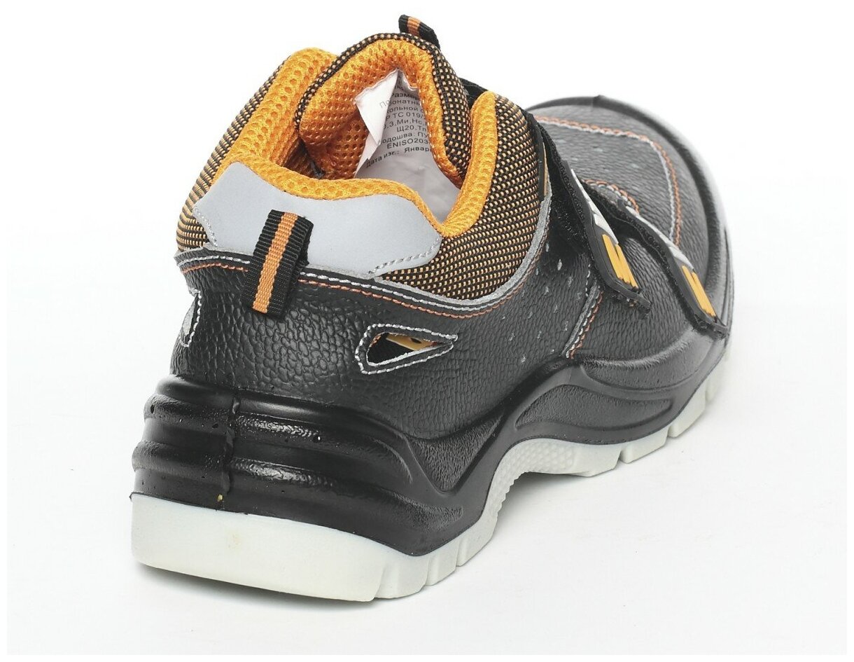 Особенности конструкции и эксплуатации рабочих сандалей. Верх рабочей обуви изготовлен из кожи. Вставки из текстиля вокруг голеностопного сустава снижают давление на ногу и уменьшают вес обуви. Отверстия на сандалиях обеспечивают теплообмен и испарения пота - это обеспечивает комфортный микроклимат для ног. Укреплённый поликарбонатный подносок выдерживающий удар 200 Дж. Подносок защищает от надавливание сверху, спереди и по бокам в носочную часть. Такая защита особенно актуальна при работе на стройке или монтаже металлических конструкций. Колодка анатомической формы исключает потёртости и снижает нагрузку на стопы. В носочной части отверстия для воздухообмена. Антипрокольная стелька 1 200 Н. Стелька защищает не только от проколов и порезов, но и уменьшает давление на стопы при хождении по неровным поверхностях, часто встречающимся на стройке или производстве. Подошва двухслойная полиуретан-термополиуретан (ПУ-ТПУ). Верхний полиуретановый слой хорошо амортизирует во время ходьбы, снижает нагрузку на суставы ног. Благодаря полиуретановому слою ботинки отличаются легкостью и удобством, термопластичный полиуретан защищает подошву от стирания и деформации. Рисунок протектора обеспечивает надёжное сцепление с любой поверхностью, есть эффект самоочищения - грязь легко отстаёт от подошвы. Метод крепления подошвы к верху литьевой. Подошва с верхом соединяется герметично, не пропускает влагу и пыль. Сферы использования: добыча полезных ископаемых, стройка, работа с металлическими конструкциями, транспорт, сельское хозяйство. Во время изготовления соблюдается ТР ТС 019/2011.
