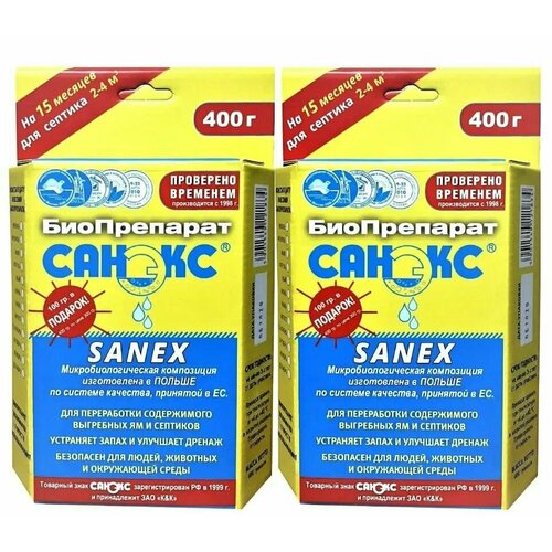 Санэкс - это высококонцентрированная и идеально сбалансированная смесь ферментов и микроорганизмов для переработки содержимого выгребных ям и септиков. Устраняет неприятные запахи и улучшает дренаж, безопасен для людей и животных. В основе Биопрепарата санэкс заложена идея выращивания живых микроорганизмов, вырабатывающих специальные ферменты, которые способны перерабатывать в огромном количестве жиры, волокна органического происхождения, включая целлюлозу и естественные отходы человека. Попадая в выгребную или сливную яму, туалет или канализационную систему, санэкс перерабатывает их содержимое до состояния мутной, без какого-либо запаха жидкости, пригодной для естественного стока в дренаж или ливневку и нейтральный по химическому составу гранулированный осадок, не превышающий 3% от общего объема переработанного органического материала. Применение препарата благотворно сказывается на улучшении деятельности дренажной системы: предотвращает заиливание дна выгребной или сливной ямы и одновременно перерабатывает отложения на внутренней стороне канализационных труб, очищая их и увеличивая просвет. Наибольшей эффективности действие санэкс достигается в условиях, когда уровень рН колеблется от 5 до 8,5, а температура окружающей среды — от 4 до 40°С. Биопрепарат санэкс реализуется в сублимированном виде. В зависимости от объема содержимого, находящегося в выгребной (сливной) яме или септике, готовится стартовая доза. Препарат заливается водой комнатной температуры и перемешивается, настаивается и набухает в течение 20-30 минут, а затем заливается в места применения (уличный туалет, септик). В дальнейшем остается только вносить ежемесячно определенное количество биопрепарата санэкс согласно инструкции. При правильном регулярном применении в результате переработки образуется мутная жидкость без запаха. В зимнее время года применение препарата допустимо только при условии, если содержимое выгребной ямы или септика не замерзает. Обслуживаемые им емкости не надо опорожнять ни перед началом использования препарата, ни в процессе их эксплуатации. Расчеты показывают, что при наличии стандартного дачного туалета первой приобретенной упаковки санэкс 400 гр. хватает на 14 месяцев регулярного использования, а следующей — на 16 месяцев. Примерно столько же препарата потребуется на выгребную (сливную) яму объемом до 4-х кубометров с дренажной системой. Основные преимущества биопрепарата санэкс: Ускоренное разложение отходов и продуктов жизнедеятельности; Разложение материалов – пищевые отходы, жир, бумага, крахмал, очистки овощей; Предотвращение образования донных осадков и корки на поверхности в резервуарах; Полная ликвидация гнилостных запахов. Страна изготовления: Польша. Срок годности: 3 года
