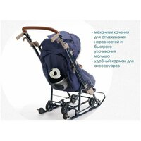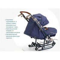 | Дополнительная информация | плоские полозья 40 мм, пятиточечный ремень безопасности, складной козырек, чехол для ног на молнии, светоотражающие элементы, широкое посадочное место, смотровое окошко для наблюдения за ребенком, выдвижные колеса на мягких шинах, регулируемая подножка, фиксатор козырька, удобный механизм качания, устройство автоматического сложения каркаса |