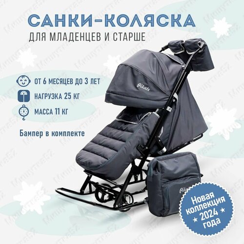 Санки-коляска Pikate Onyx выдвижные колеса, перекидная ручка, сумка для мамы, цвет Серый: сравнение цен, характеристики, фото, актуальное наличие и цены.