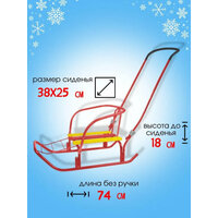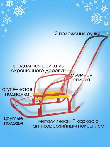«Ветерок 7+» — санки с ручкой-толкателем для катания и перевозки детей. Материал: - каркас – металл; - сидение – деревянные рейки. Преимущества: - укороченная база; - продольная рейка; - съемная спинка; - ступенчатая подножка; - 2 положения ручки; - пластиковые вкладыши под толкатель обеспечивает надежную фиксацию ручки; -грузоподъемность санок не более 25 кг. Габариты: - в разложенном виде (Д без ручки х Ш по спинке х В по спинке): 74х38,5х41,5 см; - высота санок по сиденье: 18,3 см; - сиденье (ДхШ): 38х25,2 см; - круглые полозья Ø2 см; - высота с ручкой: 96 см; - вес: 3,6 кг.