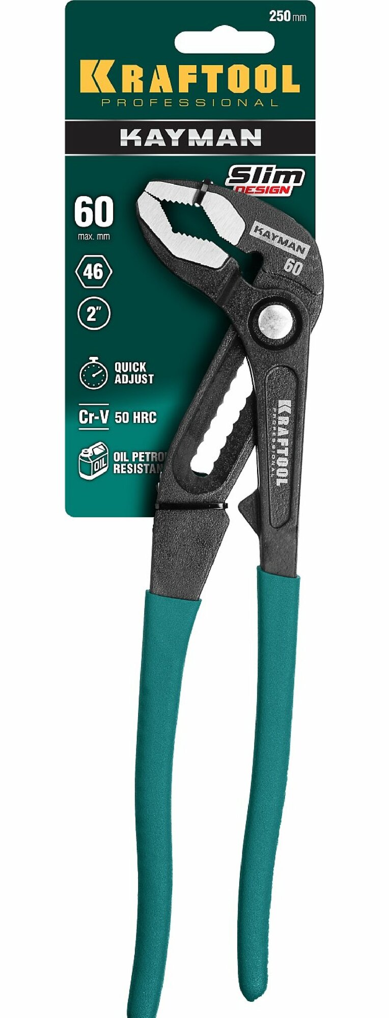 Клещи переставные "KAYMAN", быстрая регулировка, Cr-V, экстратонкие губки (6 мм) для труднодоступных мест, max захват до 60 мм, 250мм, KRAFTOOL Основные характеристики: Длина - 250мм Максимальный захват-60 мм