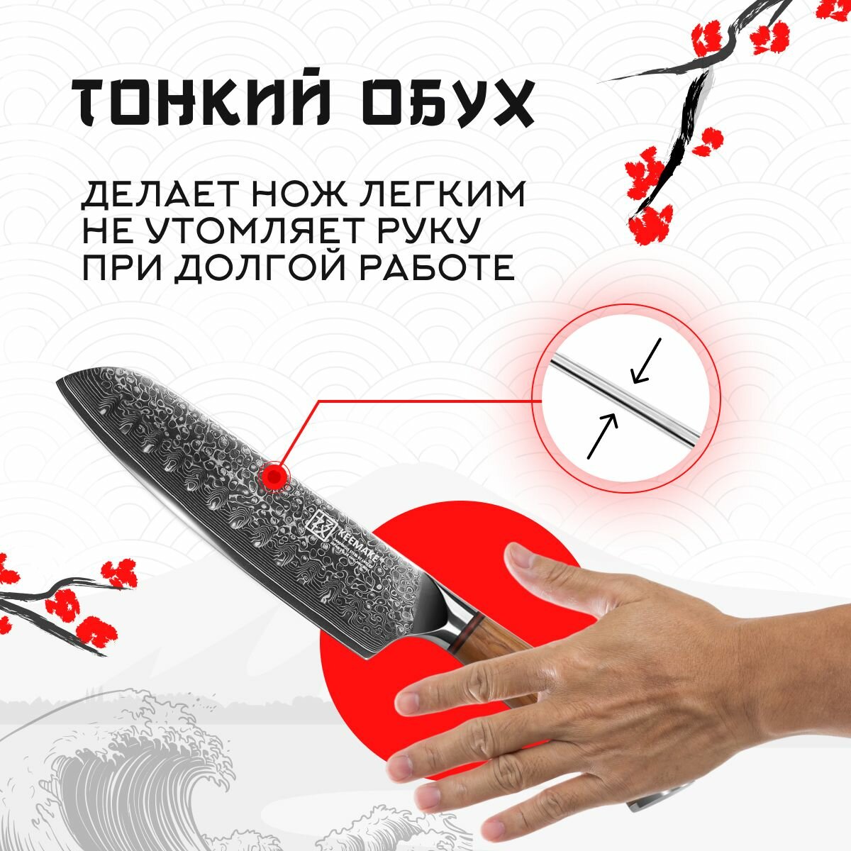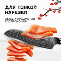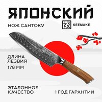 Шеф нож Сантоку P-6 от компании Keemake – это высококачественный инструмент из премиальной серии Phoenix, который создан с использованием вековых технологий производства дамасской стали. Ножи кухонные от Keemake имеют в своем сердце высокоуглеродистую сталь V Gold-10, обладающую твердостью 60 HRC по шкале Роквелла. Сантоку нож серии Phoenix отличается своим элегантным и минималистичным дизайном, который гармонично сочетается с отличными эксплуатационными качествами. Нож из дамасской стали Keemake разработан специально для быстрой и качественной нарезки всех типов овощей, зелени, работы с мясом и другими продуктами. Ножи кухонные профессиональные серии Phoenix имеют ширину и сверхострую кромку, а также идеально сбалансированный вес, что делает эти кухонные принадлежности универсальными инструментами. Широкий клинок длиной 178 мм позволяет легко справляться с любыми задачами — от нарезки лука или салата до обработки тыквы, редьки, мяса и рыбы. К тому же, ножи для кухни Сантоку можно использовать и как лопатку для переноса нарезанных продуктов с разделочной доски в посуду. Кухонные ножи Сантоку занимают минимальное пространство и позволяют применять различные техники нарезки, такие как вертикальная шинковка, шинковка с потягом в сторону рукояти или обратно. Особенно популярен метод «от себя», который часто используется японскими поварами. Универсальность, которой отличается нож поварской профессиональный P-6 из серии Phoenix, позволяет отказаться от покупки множества специализированных инструментов. Ножи из дамасской стали Сантоку от Keemake способны выполнять любые задачи, возложенные на них. Товары для кухни фирмы Keemake получили сердечник, который выполнен из высокоуглеродистой стали VG-10 и окован 67 слоями дамасской стали с добавками кобальта, ванадия и других элементов. Многослойная структура, формирующая нож для овощей и мяса P-6, создает неповторимый узор на боковых гранях клинка, делая нож кухонный универсальный из коллекции Phoenix эффектным и привлекающим внимание. В процессе производства нож столовый P-6 подвергается вакуумной термической обработке с отпуском после закалки, что повышает его твердость, вязкость и общие характеристики. Приборы для кухни обладают симметричной сверхострой заточкой, выполненной на водных камнях высокой степени зернистости под минимальным углом с двух сторон. Необычные ножи от Keemake не требуют частой заточки и готовы к длительной и продуктивной работе, обеспечивая идеальный и легкий рез. Эргономичная рукоять овального сечения комфортно лежит в руке, обеспечивая ножи столовые полным контролем над процессом реза. Она выполнена из натурального средиземноморского оливкового дерева — материала, который славится своей прочностью, влагонепроницаемостью и ударостойкостью. Ярко выраженные линии текстуры дерева создают красивый визуальный эффект, а природная маслянистая структура делает нож для мяса и овощей дополнительно защищённым. Тон дерева плавно переходит от светлого к более насыщенному оттенку, что прекрасно сочетается с холодным глянцем дамасской стали клинка. Древесина гипоаллергенна и обладает большой твердостью, что препятствует сколам, растрескиванию и износу при интенсивном использовании. Кухонная утварь легко чистится и сохраняет свою гладкую поверхность. Мозаичный пин из чистой меди украшает р