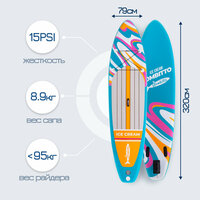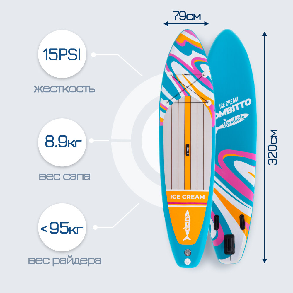 Одним из главных преимуществ сапборда для взрослых Bombitto Ice cream 10.6 является простота управления (доска резиновая для плавания Bombitto Ice cream 10.6 поставляется с надежными комбинированными веслами. Лопасти весла из прочного полимера и алюминиевый шафт с антискользящим покрытием, поэтому у вас нет необходимости в покупке дополнительного инвентаря). Научиться катанию на взрослом сапборде сможет даже пожилой человек – и для многих это становится дополнительным источником положительных эмоций. Supboard Bombitto Ice cream 10.6 весит всего 8.9 кг, в разложенном и надутом виде его длина составляет 3,2 метра, ширина – 79 см. Данная модель выдерживает нагрузку до 190 кг, что позволяет с комфортом разместиться сразу двум пассажирам – или одному с тяжелым ящиком со снастями (ведь сапборд для плавания Bombitto Ice cream 10.6 подходит не только для неспешных водных спусков, но и для рыбалки, полноценного серфинга и даже занятий йогой). Толщина доски в надутом виде – 15 см, что дает достаточную грузоподъемность и маневренность борда для серфинга.