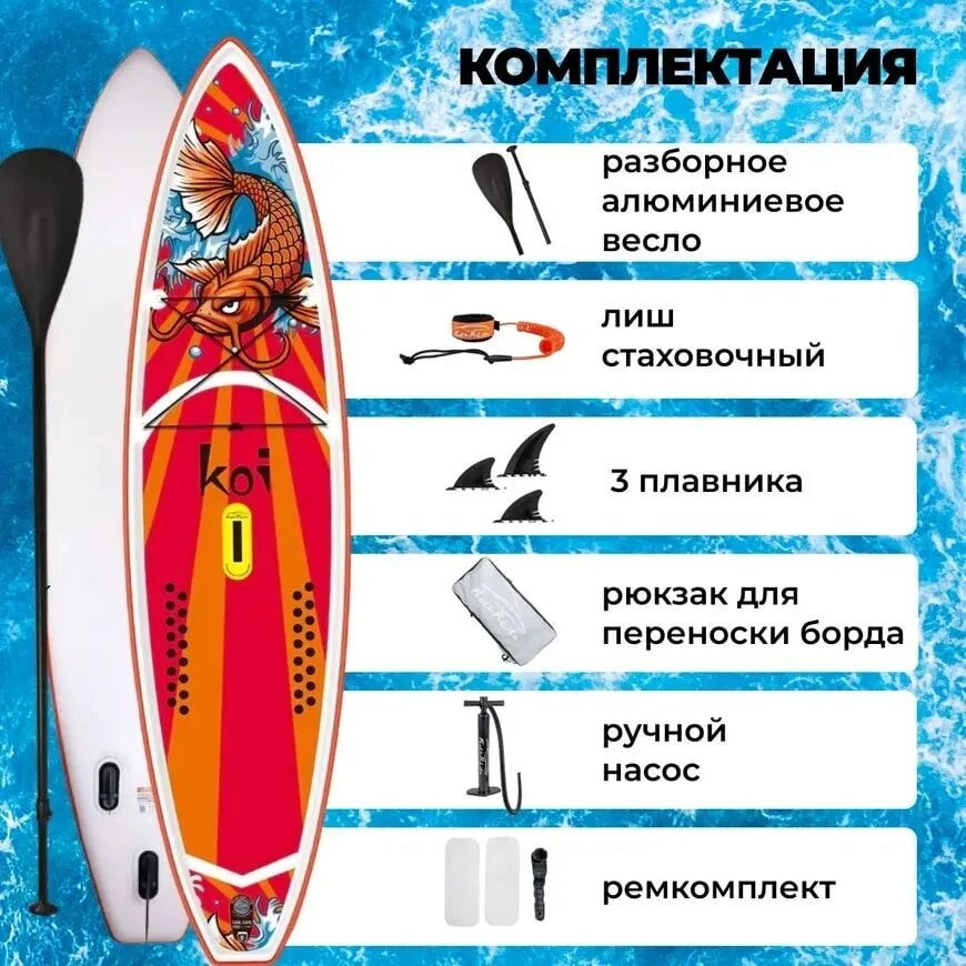 | Подробная комплектация | SUP-доска, разборное весло с регулировкой длины, плавники, рюкзак для транспортировки, страховочный трос (лиш), насос с манометром, водонепроницаемый чехол для телефона и ремкомплект |