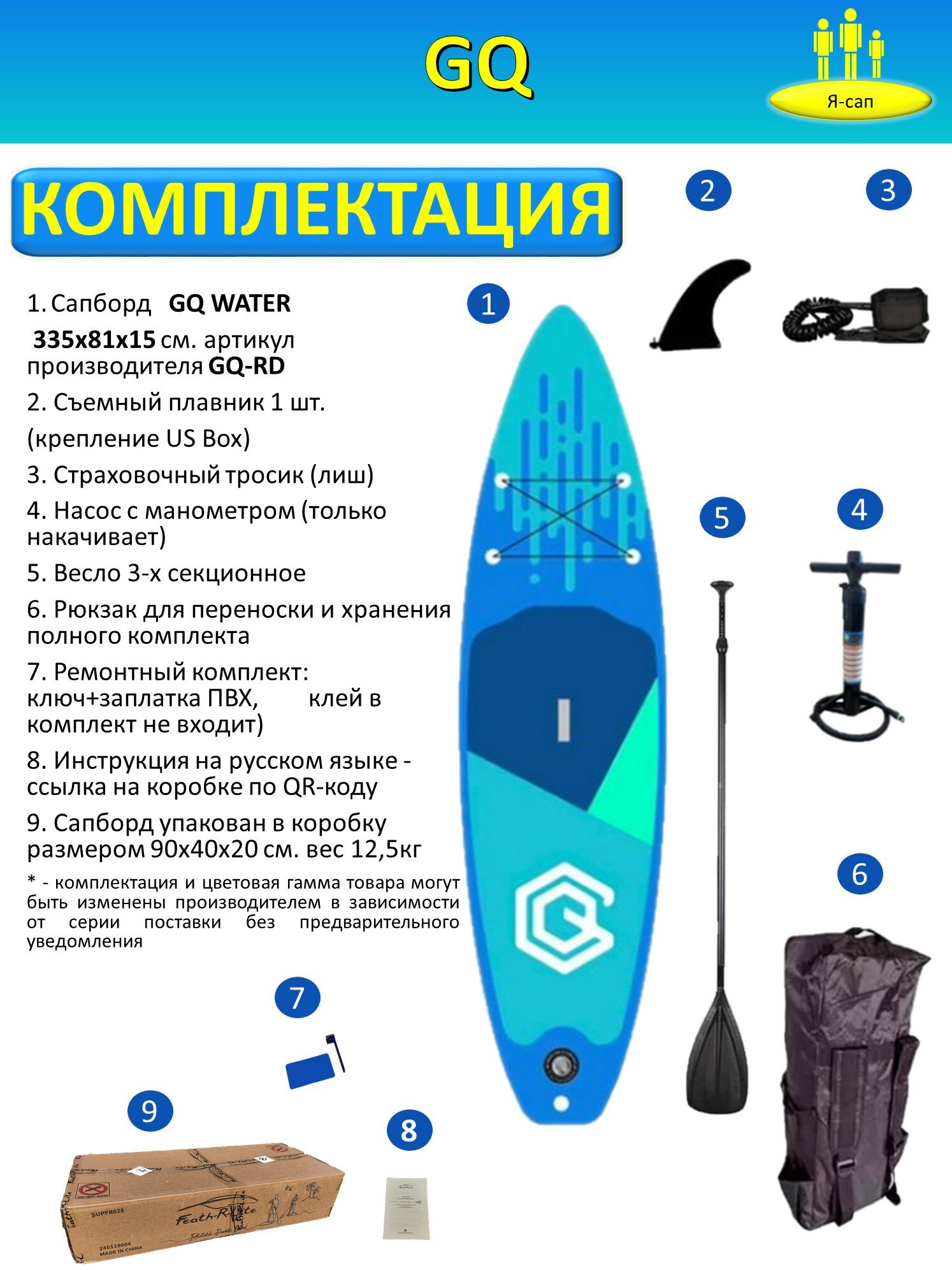 Сапборд надувной, доска для SUP-серфинга GQ-RD 11′0" Каполя ПОЛНЫЙ КОМПЛЕКТ GQ-RD Water Габариты сапборда: 335x81x15 см. / 11′0"x29"x6"; Рекомендуемая нагрузка райдера – 150 кг; Максимамльная равномерная нагрузка – 180 кг; Давление: 12–15 фунтов на квадратный дюйм; Вес изделия: 8,00 килограмма; Вес упаковки: 12,52 килограмма;